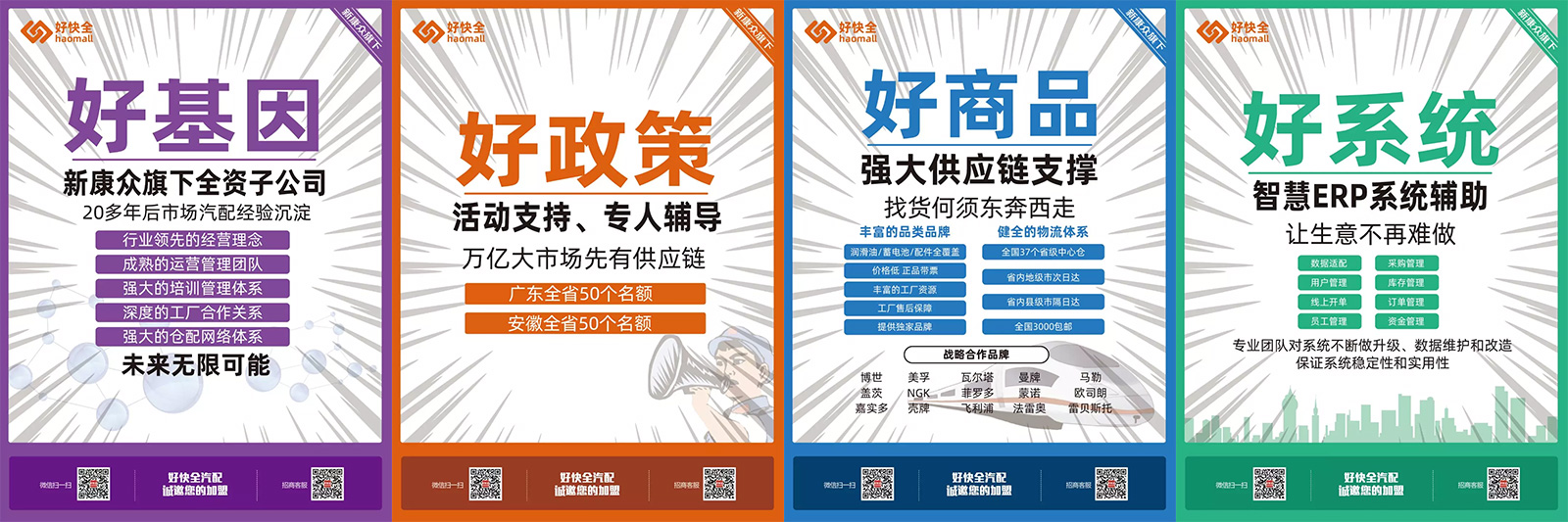 区别于一般连锁模式,“好快全汽配”将结合合作伙伴的实际情况,在享受平台提供的自营产品外,合作伙伴可自由选择其他国际知名品牌产品扩充个性化品类结构,满足地方市场差异化需求;因为品类定位更加聚焦,加之新康众的强大支持,“好快全汽配”首批开放的加盟区域将给到特殊支持的加盟费和最低备货额度,让合作伙伴轻松跨过创业投入的经济门槛,大平台,好选择!
