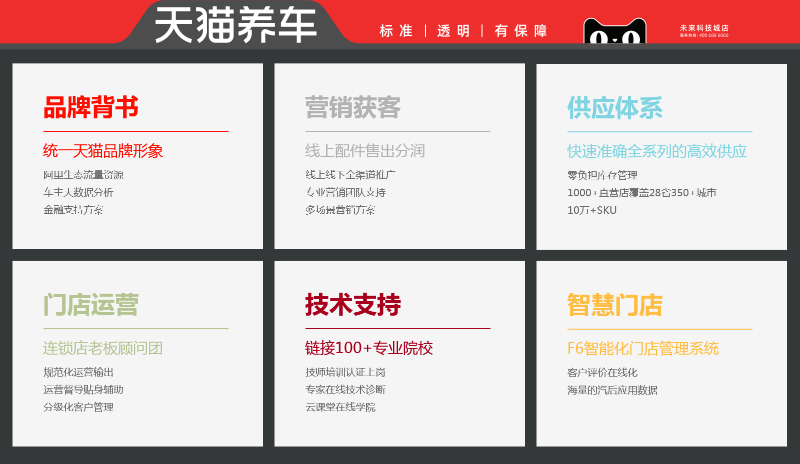 天猫养车是新康众着力打造的汽车一站式服务连锁品牌,深度整合阿里巴巴生态系统、新康众供应链和F6科技等资源。以建立”标准,透明,有保障”的服务体系为宗旨,携手线下维修门店共创消费者信赖的、线上线下一体化的汽后新零售服务品牌。2019年首站落地杭州,后又迅速在苏州张家港等城市多店齐开,目前全国申请加入天猫养车的门店已经超过20000家,正式加入天猫养车的门店也已经超过了1700家。为车主提供标准、透明、有保障的汽车维保服务。